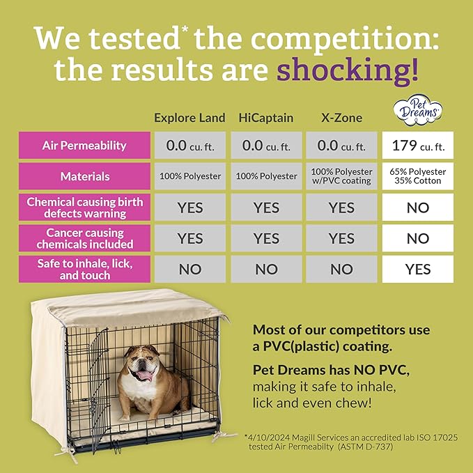 - 𝐁𝐫𝐞𝐚𝐭𝐡𝐚𝐛𝐥𝐞 𝐃𝐨𝐠 𝐂𝐫𝐚𝐭𝐞 𝐂𝐨𝐯𝐞𝐫: Clinically Tested and Rated Best Air Flow. Most Dog Crate Covers are polyester coated with toxic PVC that are Not Breathable despite false claims. Our Covers were tested by a certified government laboratory and had the highest air flow score. They are made for Indoor use and are never coated for maximum ventilation. WARNING: Never completely close your Crate Cover as it blocks airflow and creates a low oxygen environment which is not healthy for your dog