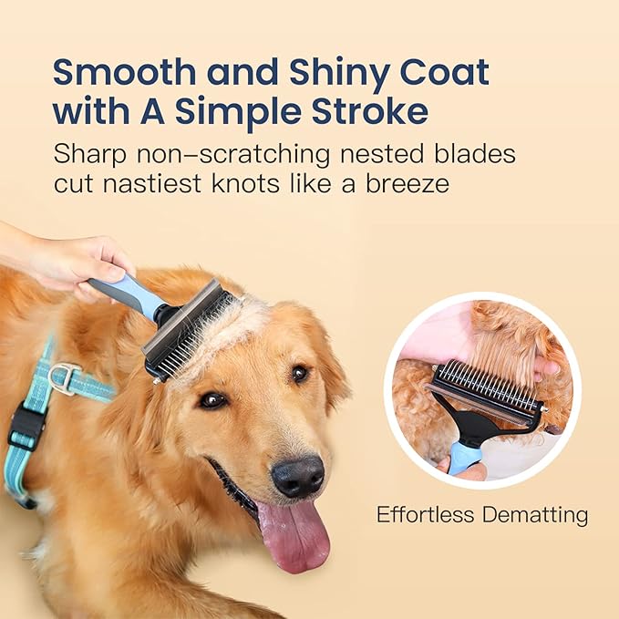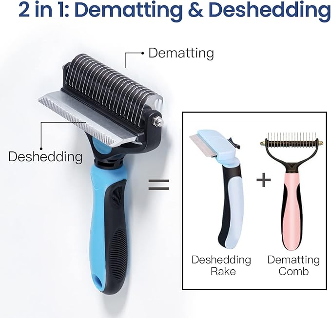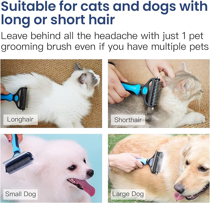 - 2 in 1 Pet Grooming Brush: Are you plagued by the unsightly fur all over your house, beds or car, and tangles of your pet’s fur? No worries about those issues with our expert 2-in-1 versatile dog cat grooming comb. The thicker teeth effectively remove tangles while the thinner teeth reduce dead or loose hair by up to 95%. With our dog cat de shedding tool, you can save time and money on visits with your veterinarian or pet groomer!