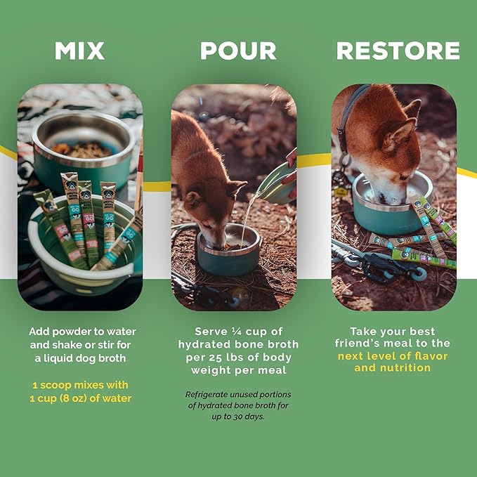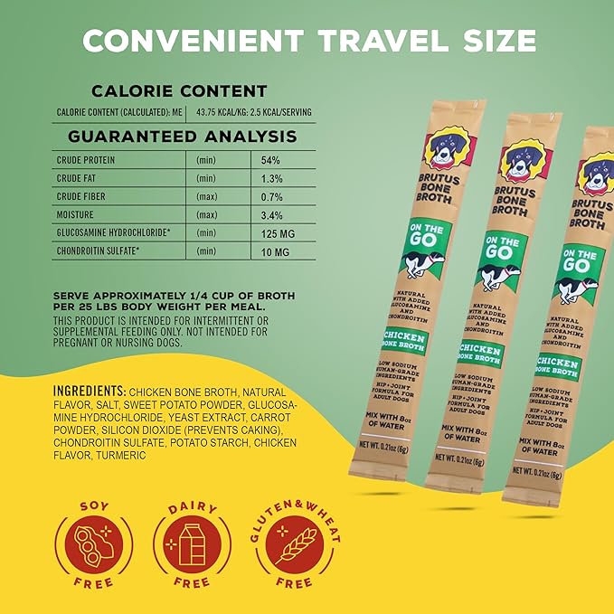 - The same bone broth taste your dog has come to know and love—now in a convenient travel size that’s perfect for when you’re on the go! Brutus Broth’s all natural bone broth powder for dogs provides your dog with the vital nutrients they need while giving them a great tasting chicken bone flavor they’ll crave