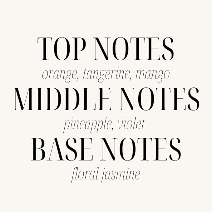 - Top notes: orange, tangerine and mango, Middle notes: pineapple and violet, Base notes: floral jasmine