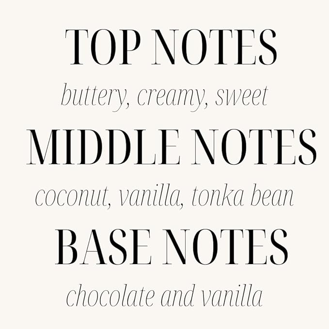 - Top notes: butter, cream and sweet, Middle notes: coconut, vanilla and Tonka Bean, Base notes: vanilla and chocolate