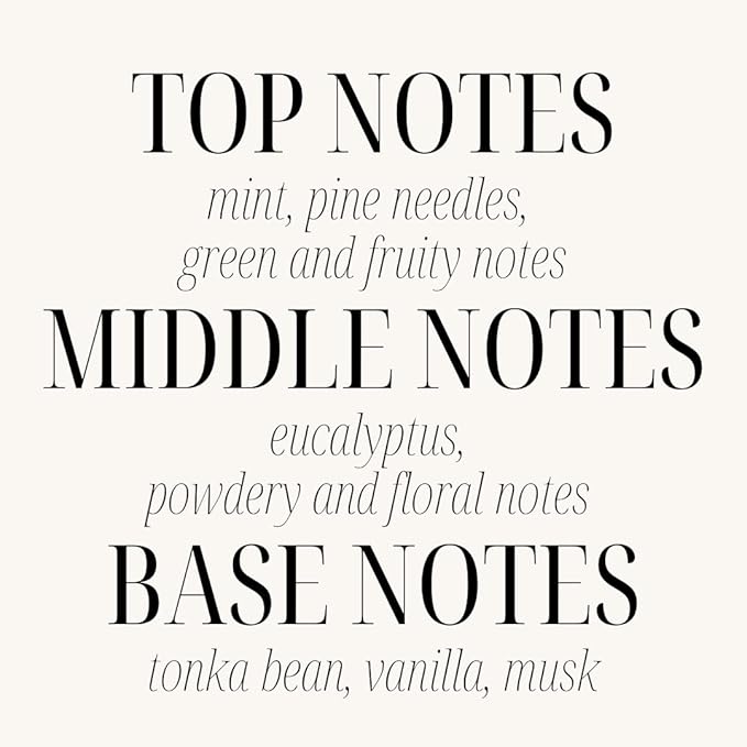 - Top notes: mint, pine needles, green and fruity, Middle notes: eucalyptus and floral, Base notes: Tonka bean, vanilla and musk