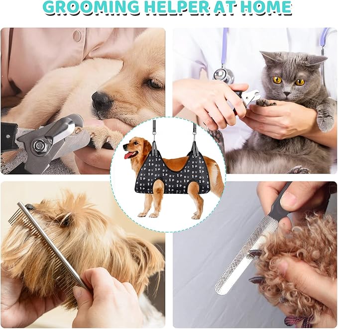 - [ Groomer's Helper for dog ]: Dog sling for nail clipping. Even at home, you can easily accomplish the same things as the pet hospital grooming table, such as trimming nails, grooming, eye, and ear health care, injections, checking various body indicators, etc. It is easy to place restraint on your fur baby in the hammock.