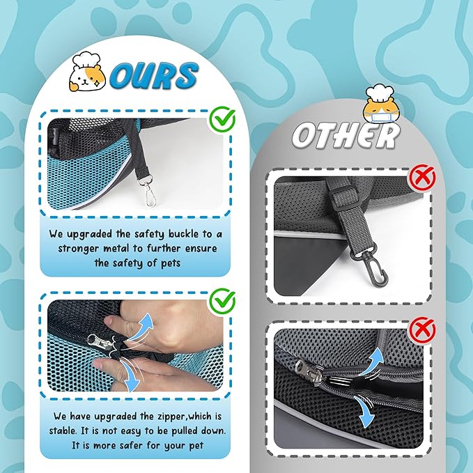 - Multi-safety Design: WOYYHO pet sling carrier has a metal safety buckle, prevents pets from jumping out, magic stick to avoid zips from sliding, the unique anti-pinch design can prevent pet hair from being caught by the zipper, and the reflective strip design makes it safer for you and your pets to go out at night