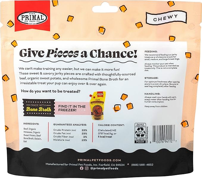- Irresistible flavor dogs love. Our beef dog treats are made with real Primal Bone Broth and organic sweet potato for dogs
