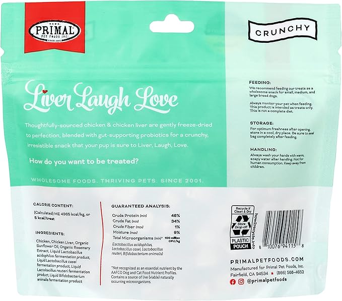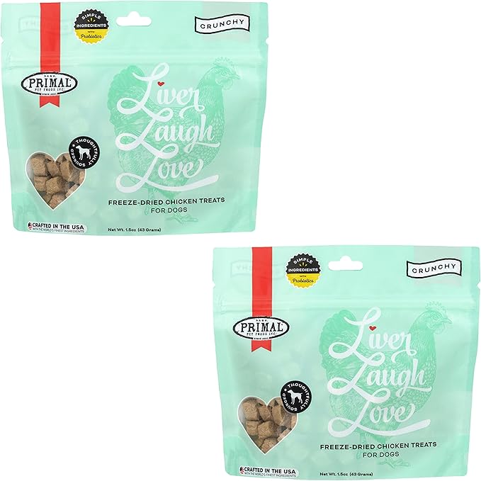 Primal Freeze Dried Dog Treats; Chicken Liver Dog Treats with Probiotics for Dogs; Liver, Laugh, Love; Crunchy Grain Free Training Treats for Dogs, 1.5 oz (Pack of 2)