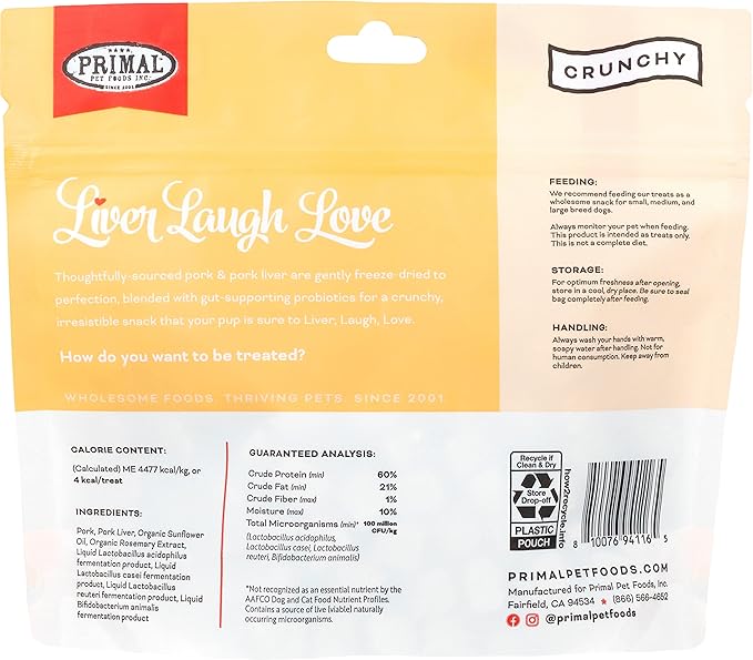 Primal Freeze Dried Dog Treats; Pork Liver Dog Treats with Probiotics for Dogs; Liver, Laugh, Love; Crunchy Grain Free Training Treats for Dogs, 1.5 oz (Pack of 2)