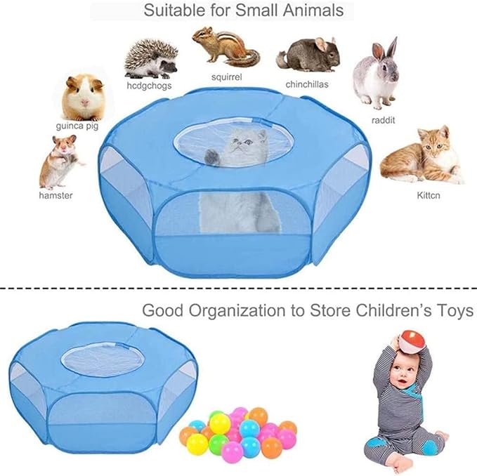 Small Animal Playpen,Portable Small Animal Cage Tent Breathable Pet Playpen Cage Tent Pop-Up Outdoor&Indoor Exercise Fence for Hamster Guinea Pig Rabbit Puppy Hedgehog (Blue with Cover)