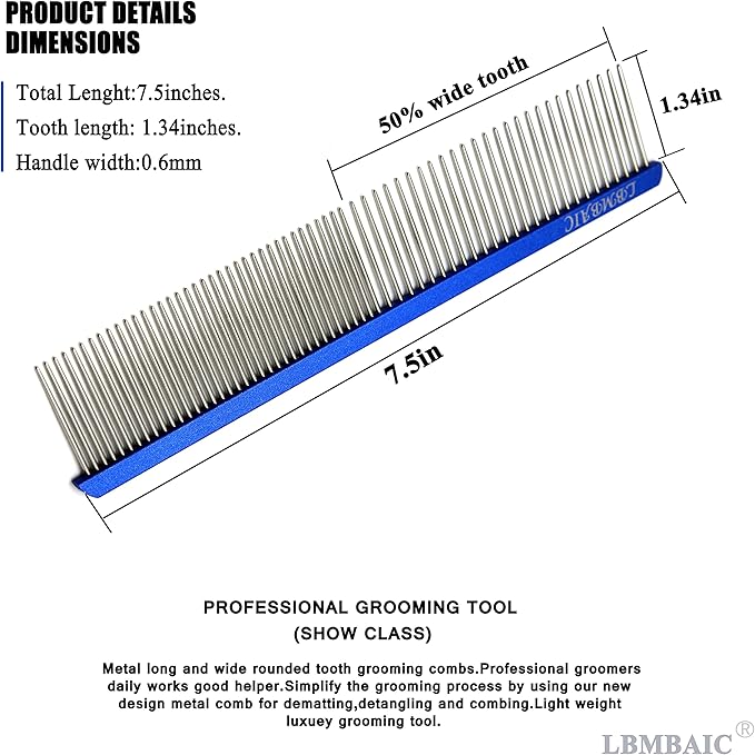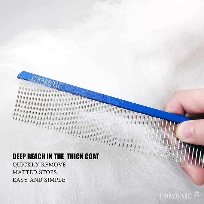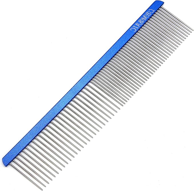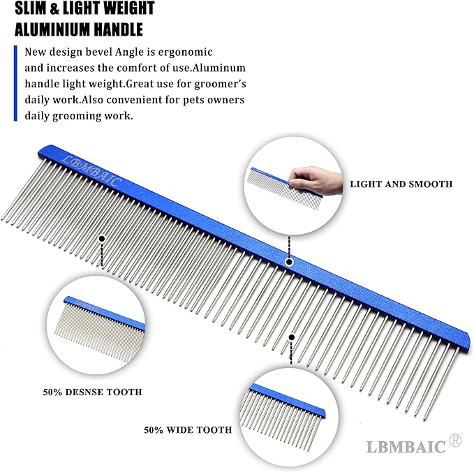 - 【FLAT DESIGN LACQUERED MATTE ROYAL BLUE HANDLE.】This grooming comb for dogs handle 0.6mm wide full aluminium material light weight and strong.Pet comb dogs curved grinding at the end of the handle is ergonomic and more suitable for use. Royal blue baking finish, strong color, not fading.