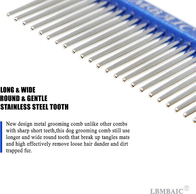 - 【LONGER AND WIDER TAPERED STAINLESS STEEL PINS.】Our long comb for dogs pins are 50% dense and 50% wide teeth double sides 34mm.This dog metal comb grooming have full stainless steel round pins no hurt pet skin.dog comb long teeth can reach deep coat for long hair dogs and cats.great for shedding tangles,mats and knots.The dog grooming comb roundhead pin design, with a smooth surface and no burr, can be used to retouch and massage and form a healthy skin.