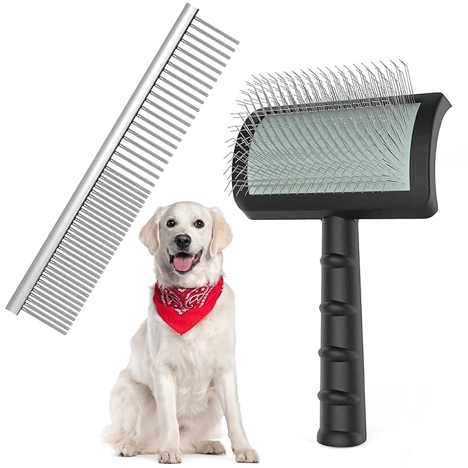 Large Slicker Brush & Pet Comb Value Kit, Extra Long Pin Dog Grooming Wire Brush and Deshedding, Removes Long and loose Hair & Undercoat, Black-comb, Hair Type: Curly, Unisex