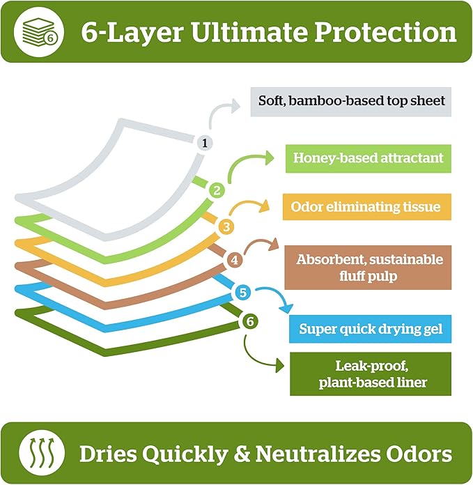 - 6-Layer Quilted Protection - Our special honey-based attractant helps your puppy mark the spot without missing, while the ultra-absorbent core turns liquid to gel upon contact - neutralizing odors and keeping the area dry.