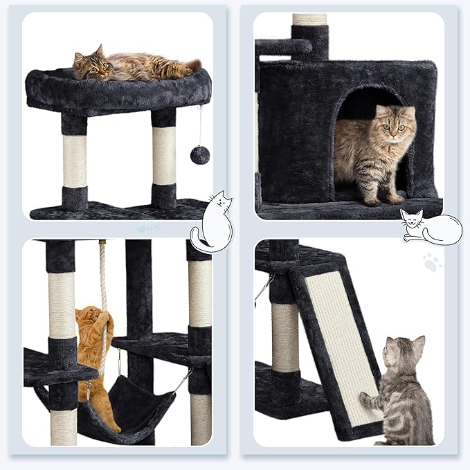 - GOOD FUNCTIONALITY: The large cat tower has multiple levels for cats to play and sleep, including a top perch with a danging ball, a condo, a hammock, a hanging rope, a scratching board, seven scratching posts, and some extended platform space