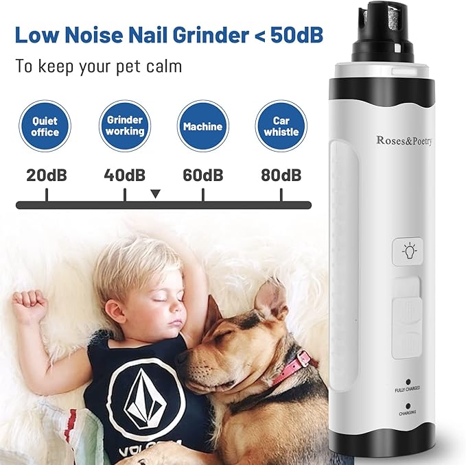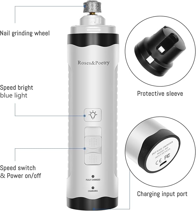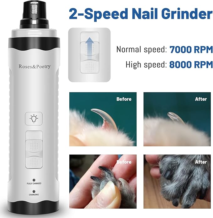Roses&Poetry Nail Grinder with 2 LED Lighe and 3-Speed Electric Rechargeable Pet Nail Trimmer Painless Paws Grooming & Smoothing for Small Medium Large Dogs & Cats