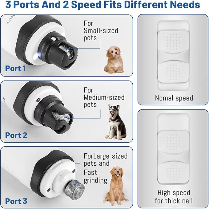 - Advanced 2-Speed Switch & 3 Grinding Ports: The trimmer features an adjustable, low-high speed design powerful enough support heavy grinding. And with 3 ports to match small, medium, or large dogs,cats,pets, simply choose the appropriate port and speed depending on your pet's size and nail hardness.