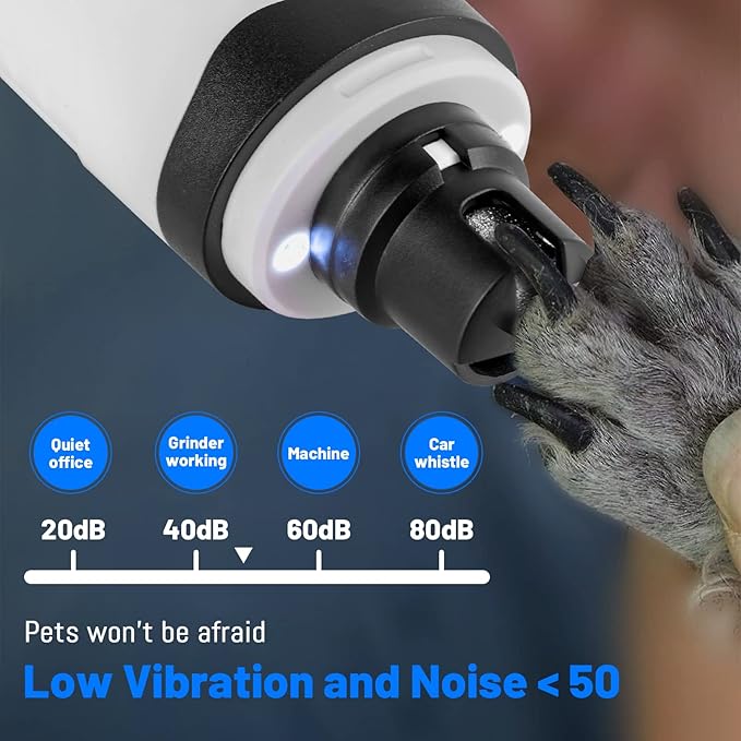 - Super Low Noise & Vibration Dog Nail Clippers: Many pets get stressed by the sound and vibration of pet nail grinder. However, our electric pet nail grinder uses a superior motor with whisper-quiet technology that produces a very low vibration to keep pets calm then help sand pets claws faster and easier. It’s great for new pet owners and professional pet groomers alike.