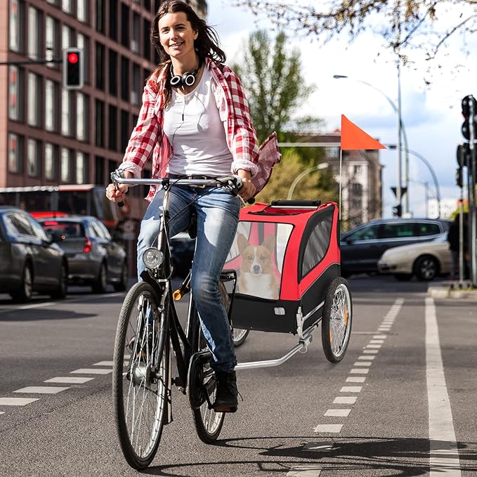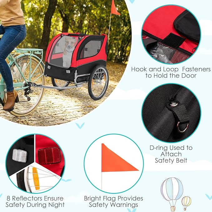 - Superior Safety Guarantee: The pet trailer is equipped with 8 reflector lights and 1 red safety flag. The bright colors will provide warning to surrounding vehicles and pedestrians, and improve safety when driving in low light conditions. In addition, there are D-rings inside the pet trailer that can be used to attach a safety rope to prevent your pet from falling.