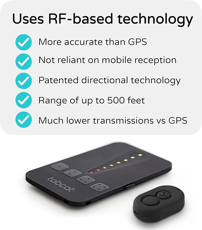 - LONG-LASTING: With long battery life (3 to 12 months depending on use) and minimal radio frequency emission, TabCat is a safer and longer-lasting option compared to GPS trackers that require frequent recharging and much more powerful transmissions