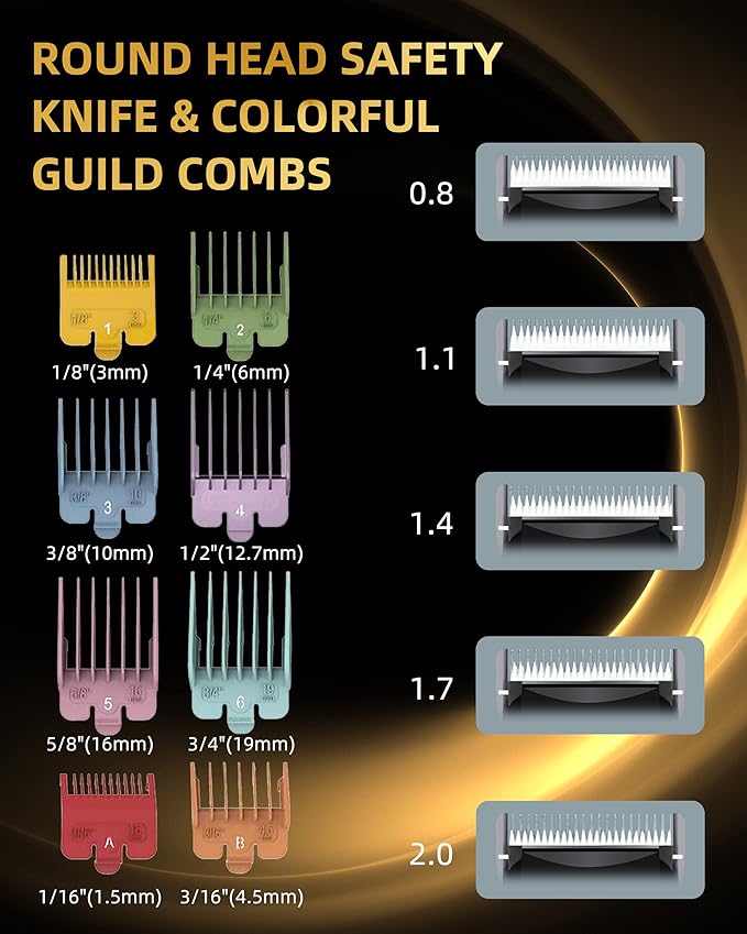 - 【Complete Grooming System】8 color-coded comb guides cover all coat types: 1.5/3mm: Paw pads & sanitary trims. 4.5/6mm: Summer cuts & short styles, 10/13mm: Teddy/Poodle body shaping, 16/19mm: De-shedding & undercoat removal