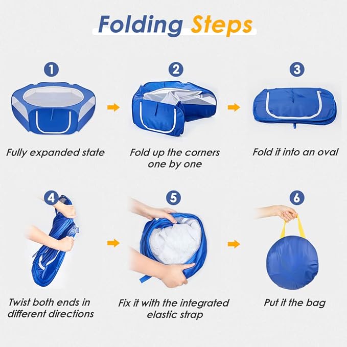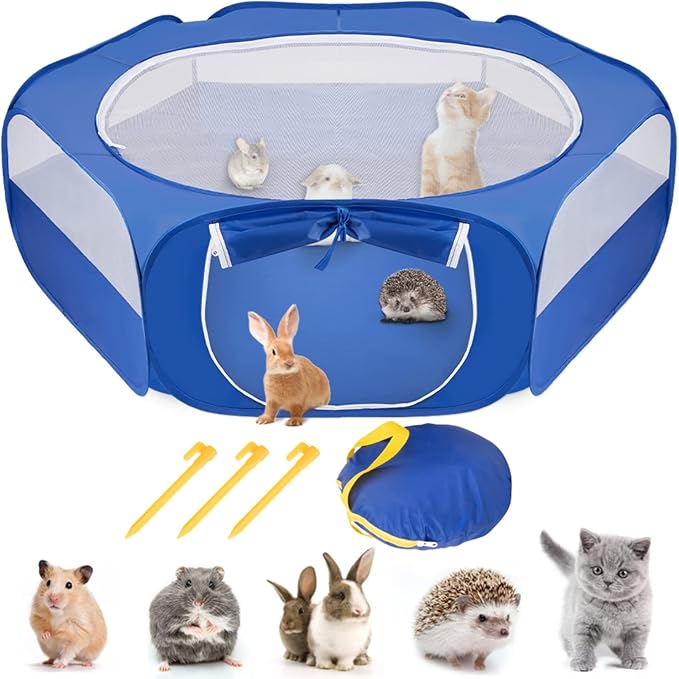 SlowTon Small Animal Playpen Portable - Durable Cat Playpen with Reinforced Mesh, Foldable Pet Playpen Exercise Play Pen with Zipper Top Cover Puppy Fence Kitten Rabbit Ferret Chinchilla (M,Blue)