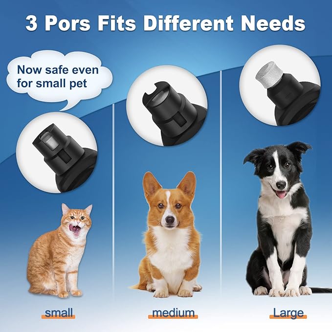 - 【Advanced 3 Speeds & 3 Grinding Ports】: This dog nail grinder has been upgraded with a higher quality motor. Our dog nail trimmer has an adjustable low to high speed design that can strongly support heavy grinding. Also 3 ports can match small, medium and large pets. 3 different speeds and 3 grinding ports, perfect for choosing the right port and speed according to your pet's size and nail hardness