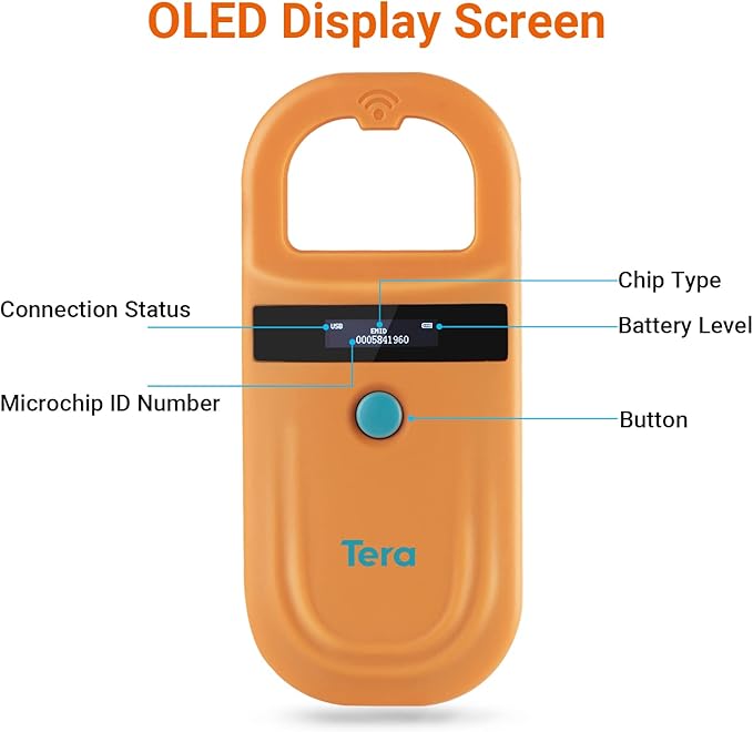 - ใOLED Display Screenใ Teraโs handheld pet reader uses a high brightness OLED display, which can be clearly displayed under indoor light or strong outdoor light/sunlight conditions.