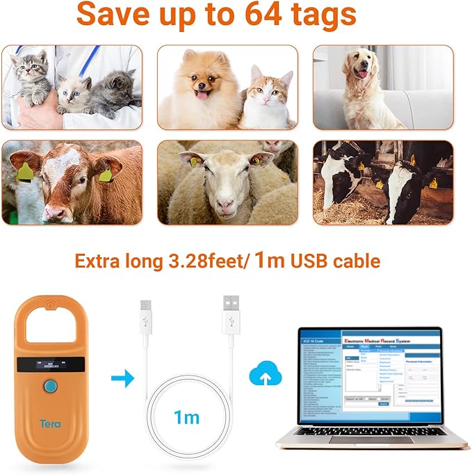 - ใSufficient Data Storage Capacityใ Tera Pet Scanner has extremely fast scanning speed and can save up to 64 tags information, you can upload these information to your computer via USB cable.