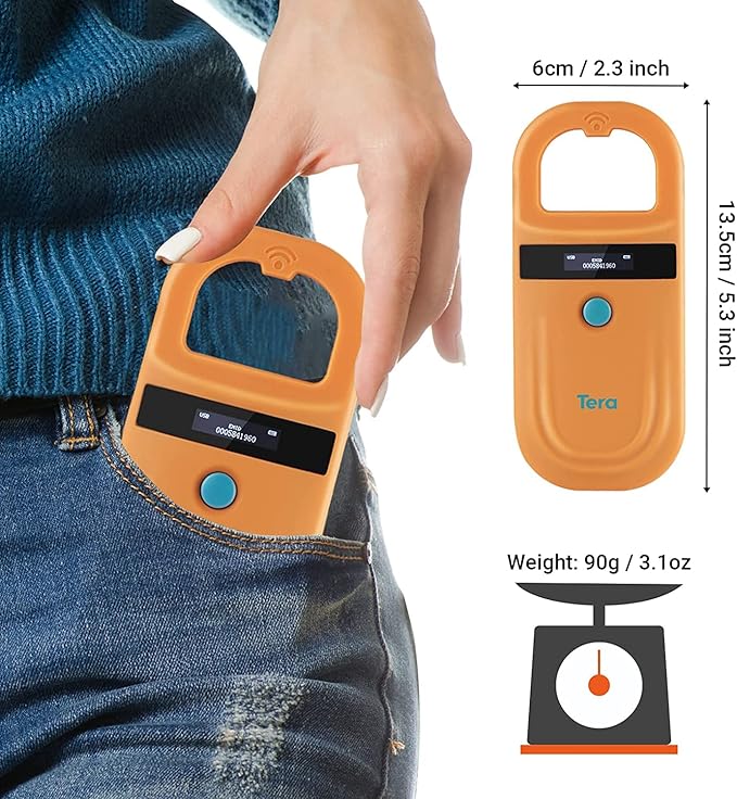 - ใD-ring Included for Easy CarryingใPackage includes: 1x Microchip Scanner; 1x Extra D-ring; 1x USB Cable (3.28 ft); 1x User Manual; Tera pet chip ID scanner supports ISO11784 / ISO11785 / FDX-B (15 digit microchips) and EMID (15 digit microchips). Easy to operate, one button to read. ๐๐จ๐๐ฌ ๐ง๐จ๐ญ ๐ฌ๐ฎ๐ฉ๐ฉ๐จ๐ซ๐ญ ๐ ๐๐-๐ ๐จ๐ซ ๐๐๐๐ ๐ฆ๐ข๐๐ซ๐จ๐๐ก๐ข๐ฉ.Please check if scanner supports your pet microchip before purchasing.