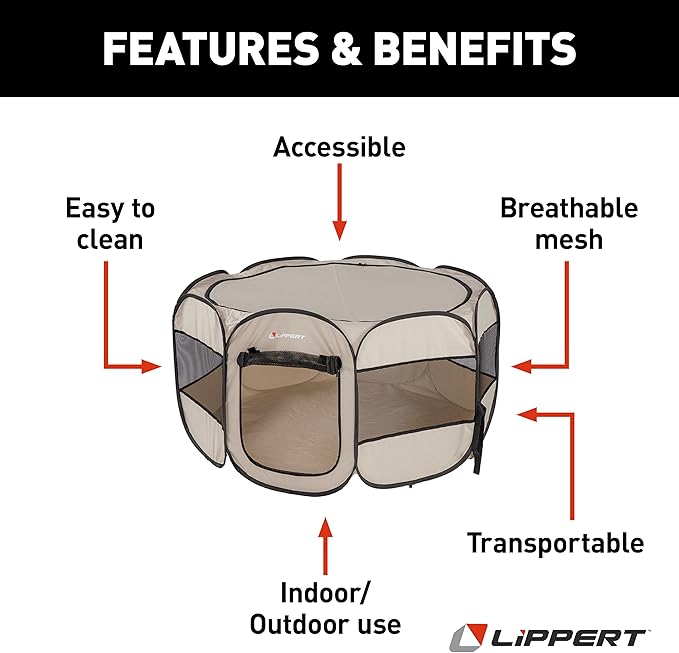 - INDOOR/OUTDOOR USE – The Lippert portable pet playpen makes a perfect enclosed space for your pet to play inside or outside your home. You can even pack it up and take it on your next trip to the beach, park or campground