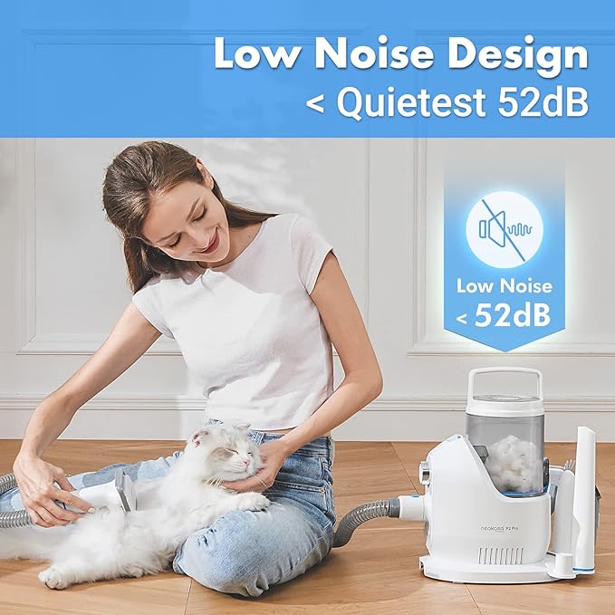 - 【Low Noise Design】 This pet vacuum cleaner has 3 suction speeds with a low-noise design to help the pet feel at ease and no longer afraid of haircuts. We suggest grooming your pet with our brush before trimming pet hair, and treating your pet with little snacks to avoid making your pet nervous because of vacuuming noise, which conclusively makes the grooming experience even more enjoyable.