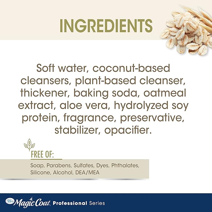 - pH-balanced dog oatmeal shampoo is free of DEA, MEA, phthalate, parabens, dye, sulfates, alcohol, soap, and silicone