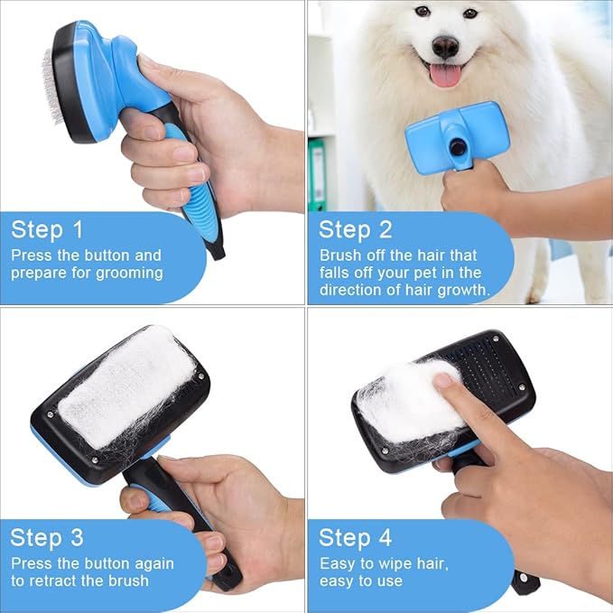 - SELF-CLEANING SLICKER BRUSH Removing knots, dander, and loose hair from your pet’s fur just got easier. Press the button on the slicker brush after you’re done and watch the bristles retract and the hair fall right off.