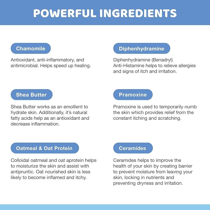 - RELIEVES DRY, ITCHY SKIN, & ALLERGIES - Our blend of ultra soothing ingredients like Pramoxine, Diphenhydramine , Chamomile extract, Shea Butter, Ceramides, and Oatmeal to moisturize the skin and reduce itching, irritation, dandruff, flakiness, dryness, and redness caused by seasonal allergies.