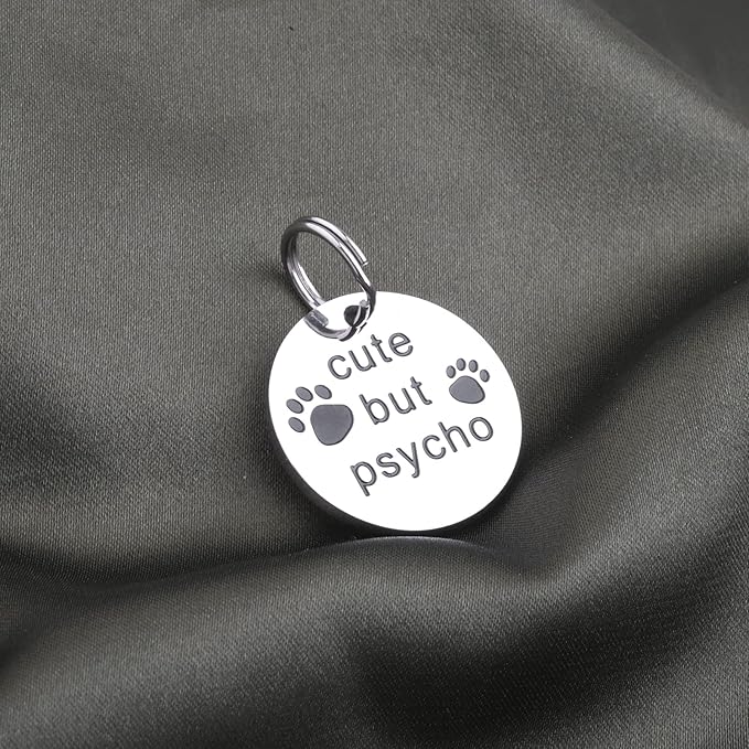 - Description: Pet collar tag engraved with ‘cute but psycho’. A funny pet tag for your lovely cat or dog, making novelty addition to your pet’s collar.