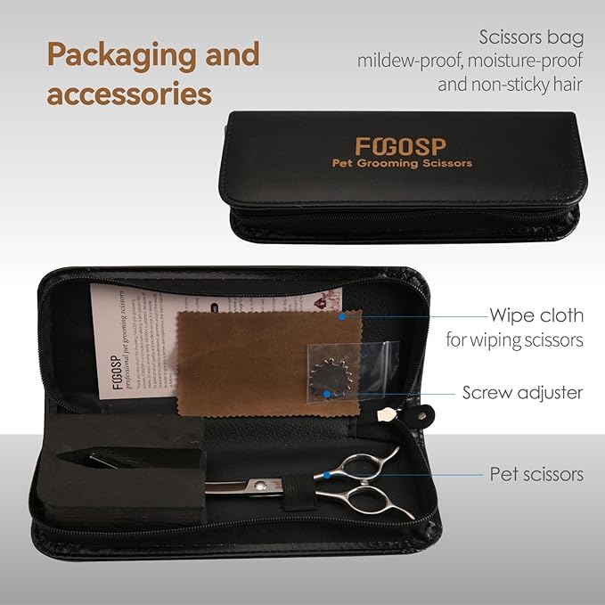- 🌈[Professional dog grooming scissors] FOGOSP king series curved scissors is designed for groomer with heavy daily grooming work. 45 degree large arc curved shears can more efficiently trim the perfect arc effect. Greatly reduce your grooming work intensity.