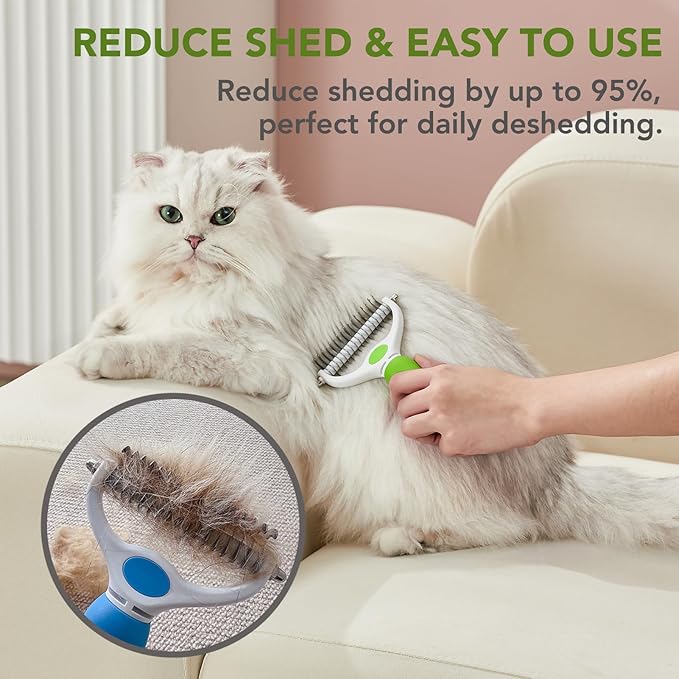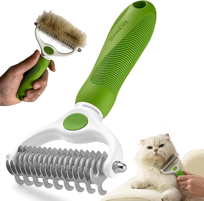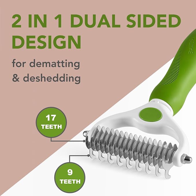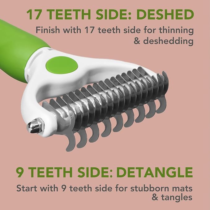- DUAL SIDED DOG GROOMING BRUSH: The double sided undercoat rake for dogs & cats has a different number of teeth on each side. The lower density side is a dematting rake for stubborn mats and tangles. The higher density side is a detangler, deshedding tool, or undercoat rake for faster results thinning and to control shedding.