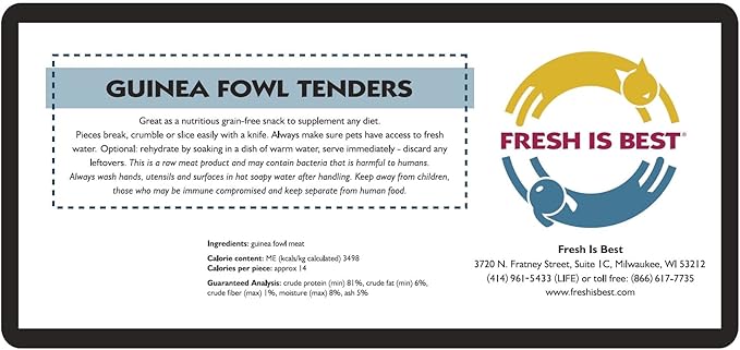 - Guinea Fowl Tenders - This 3 oz bag contains only fresh freeze dried high quality guinea fowl breast. All natural raw meat, no added hormones, preservatives, or fillers. 100% grain, gluten and starch free, human quality ingredients.