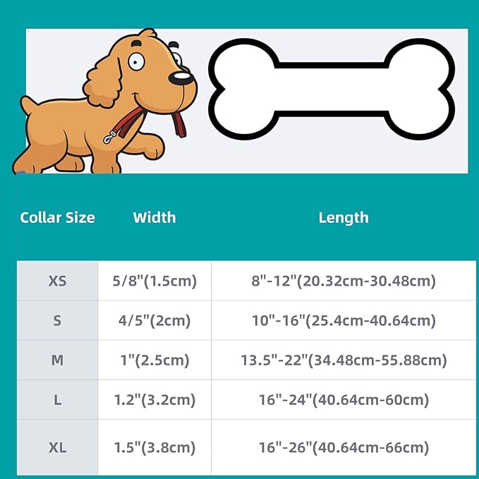 - Durable Dog Collar Size: Adjustable dog collar for large dogs & dog collar for small dogs. Collar for dog size-XS(5/8"Wid*8"~12"Len), S(4/5"Wid*10"~16"Len), M(1"Wid*13.5"~22"Len), L(1.2"WId*16"~24"Len), XL(1.5"Wid*16"-26"Len)