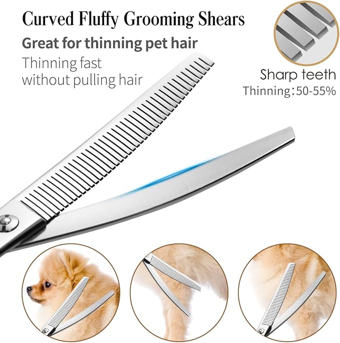 - 🐶[Fluffy Effect] With 42 teeth in the comb-tooth blade and a sharp convex edge. After using the trimmers or push shears, these curved thinning shears smooth out jagged fur, blending raw shear marks of hairs and thinning out thick coats, leaving your pet looking fluffy and super cute.