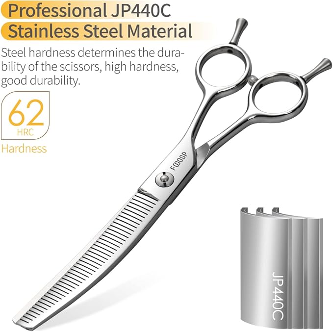 - 🐶[Finest Material] Cold treatment high quality and durable Japanese 440C stainless steel shears with 42 comb teeth, 35% thinning rate. FOGOSP curved comb grooming scissors are tempered with Hand-sharpened cutting edges and precise, convex edge, hollow-ground, extremely sharp blades, which are not easy to pull or catch fur ends.