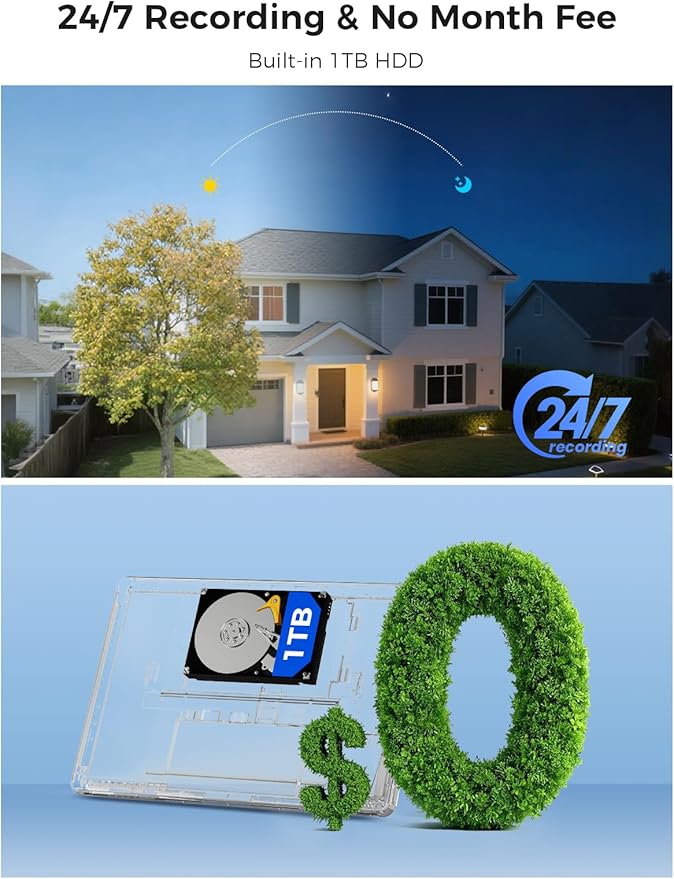 - 24/7 Recording & NVR 10 Channels: Upgraded H.265+ tech is able to occupy less storage space without decreasing image quality, which can extend the recording duration. The 1TB hard drive preinstalled ensure a recording over 45 days under 24x7 video recording mode. No Monthly fees is needed. The NVR supports 4K image output and max. 10 Channels cams recording at the same time. (NOTICE: THE CAMERAS ARE NOT SOLAR POWERED. THEY NEED PLUG-IN POWER SUPPLY)