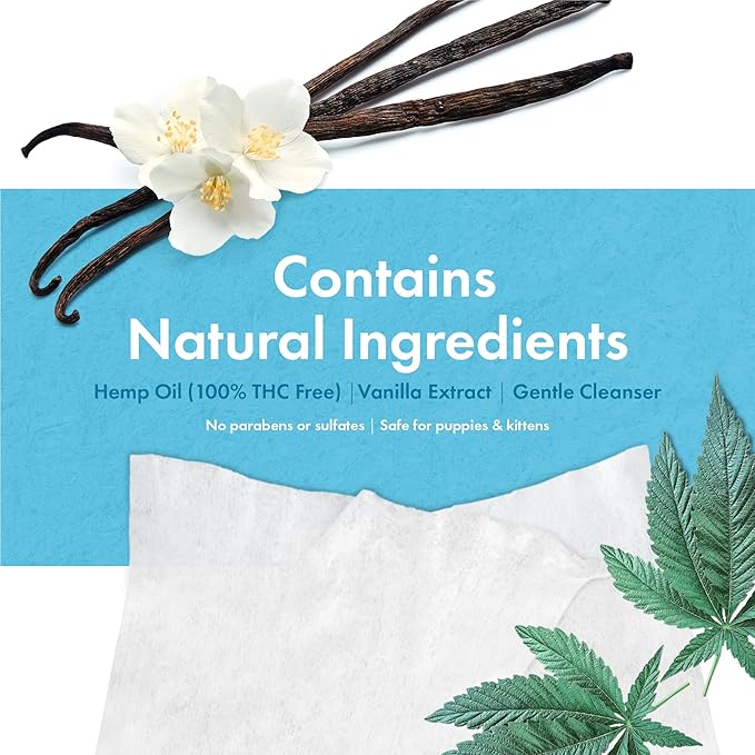 - Soothes, Calms & Conditions - Each wipe is moistened with a gentle cleansing formula combining Hemp Oil and soothing vanilla extract to clean, condition and soothe itching and irritation. Won't remove spot flea treatments. 100% THC free.