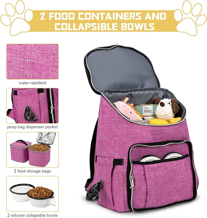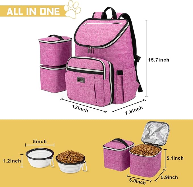 BAGLHER Travel Dog Backpack - Detachable Travel Dog Food Container for Pet Supplies Dog Gear Backpack,Dog Bag for Traveling with 2 Silicone Collapsible Bowls and 2 Food Baskets Pink
