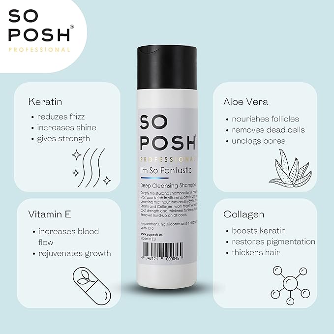 - Highest Quality Ingredients for Easier Coat Management - Our shampoo, free of allergens, harsh preservatives, SLS, parabens, and silicones, ensures your pet's safety. For an anti-static, smooth, and shiny coat that's easier to manage, use our 'I'm So Fantastic' Conditioner after washing. Enjoy the ease of detangled, lustrous, and manageable fur with SO POSH.
