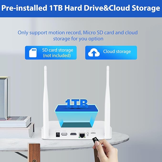 - Preinstalled 1TB HDD Storage& 24/7 recording: System preinstalled with 1TB HDD, the camera will store the motion detection record in real time, not support 24/7 days continuous recording. Connect with network, allow to check those record on phone app "Eseecloud" or Computer software"Eseecloud".