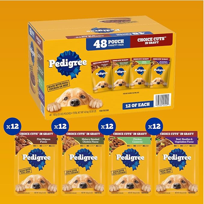 - 48 Count: Pedigree Choice Cuts In Gravy Adult Soft Wet Dog Food Variety Pack contains twelve (12) 3.5 oz. Pouches of Hickory Smoked Chicken, twelve (12) Filet Mignon, twelve (12) Beef, Noodles & Vegetables, and twelve (12) Chicken Casserole
