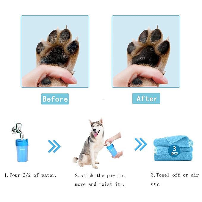 - 【 EASY TO USE & CLEAN】Just pour 2/3 water, insert the muddy paw, do the twist for several times, then towel off with the accessory. after use, you can detach easily, rinse and put it on the wall(NOTE: it comes with 3 towels, which is handy for families with multiple dogs and can also be used interchangeably.)