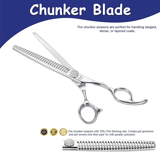 Professional Chunker Dog Grooming Scissors with Simulation Diamond 440C Stainless Steel Polished Pet Cat Trimming Texturizing Shears for Groomers and Home users 7''