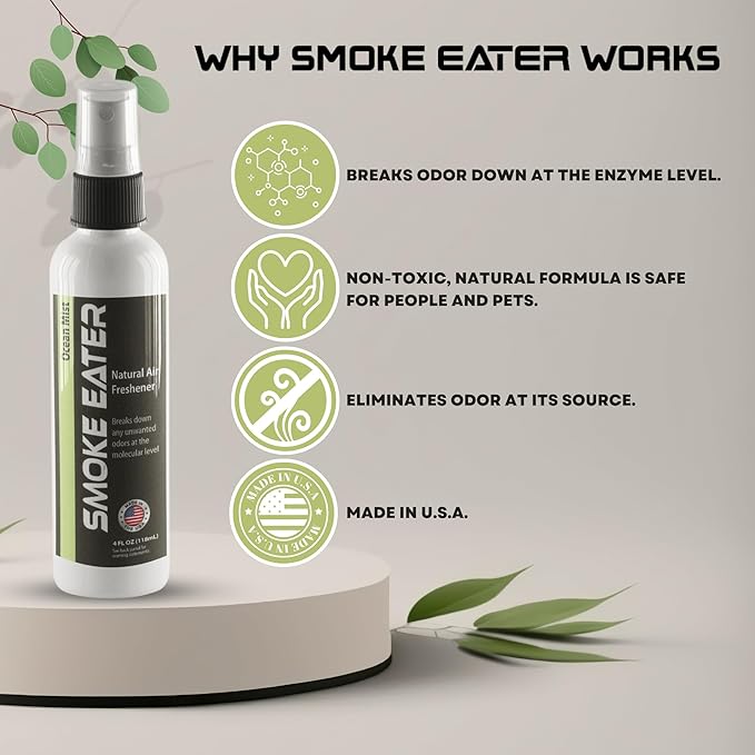- BREAKS DOWN ALL ODOR AT THE MOLECULAR LEVEL - This is not a “mask” to hide the odor, it actually eliminates odors at the source by breaking the enzymes down and leaving the surface smelling clean. The scent of Smoke eater even disappears after about 15 mins, leaving the room smelling like you never sprayed a thing