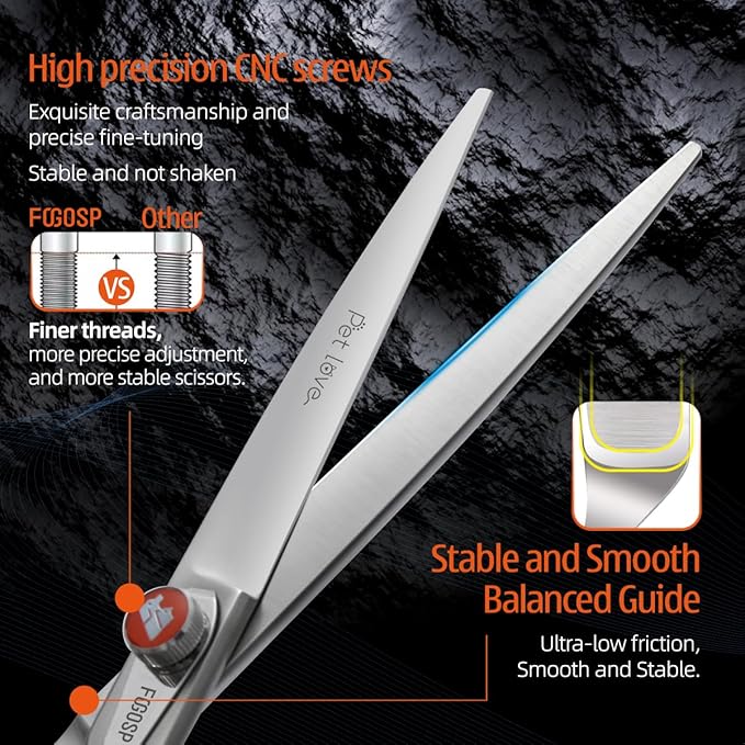 - 💝[Excellent Quality]FOGOSP dog grooming scissors is made of high quality Japanese 440C stainless steel and is very sharp and smooth that using these grooming scissors is like cutting butter with hot knife. Custom Leaf-Spring Tension Modifier Knob, making more silky smooth to use. Classic low-press offset handle making them comfortable and lightweight to hold, effectively avoid wrist joint injury.Good Tools Make You Enjoy Your Work Even More.